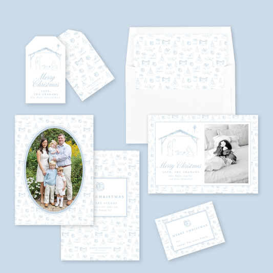 Christmas Toile Nativity Card in Blue - Landscape