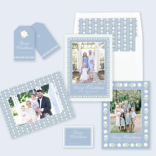 Gardenia Border Christmas Card in Dusty Blue