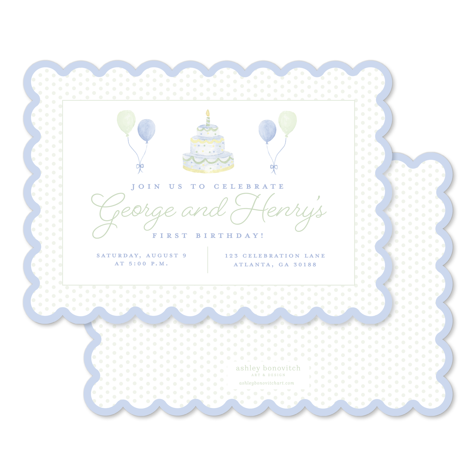 Set of 25 personalized invitations with envelopes, printed on 120 lb. heavy textured paper.