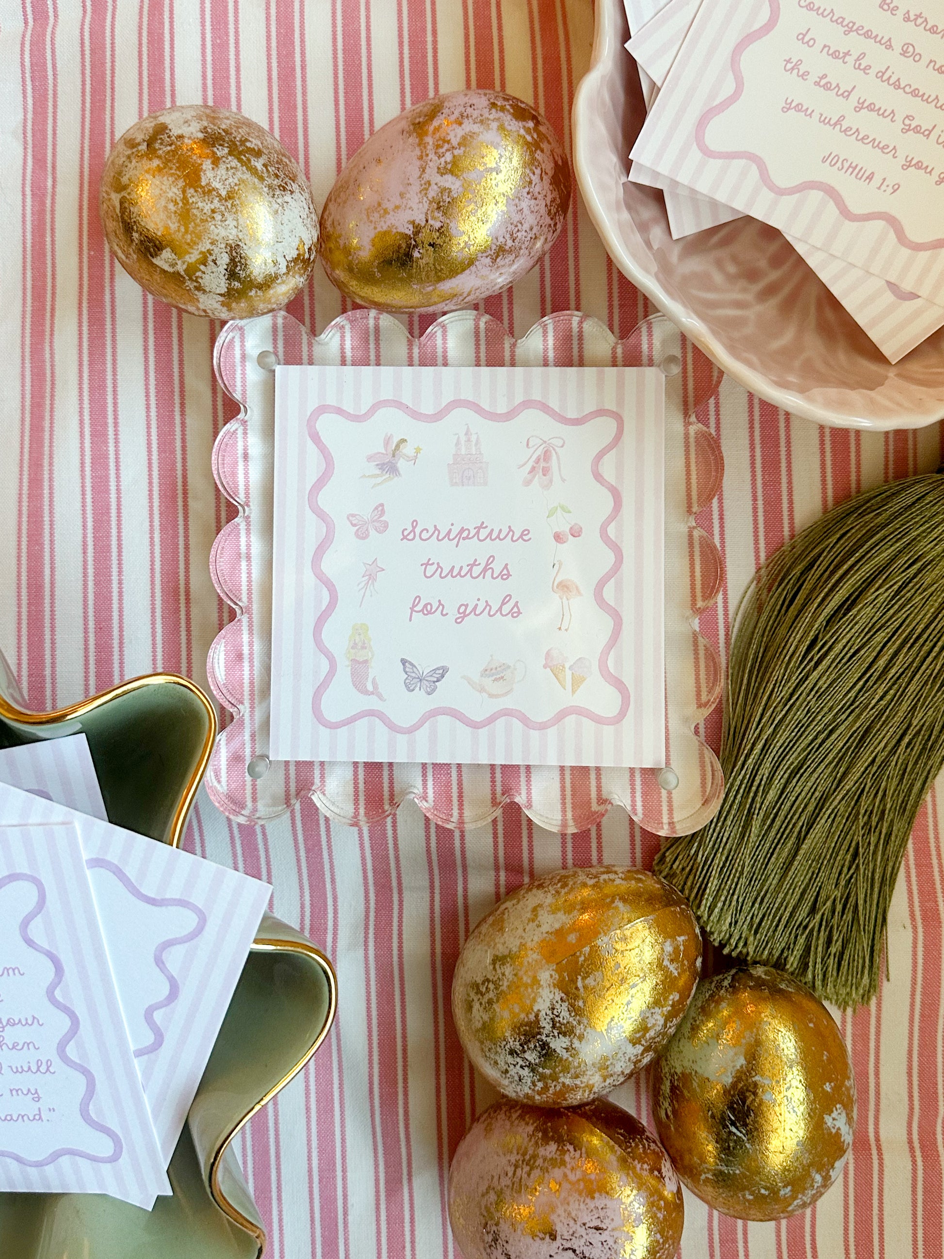 Scripture cards are 4-inch squares, come in a set of 10, and include an acrylic easel stand. Original artwork is scanned at high resolution and made into scripture cards printed on luxe, heavy paper stock. NEW option: add a Scalloped acrylic frame to display the scripture cards.